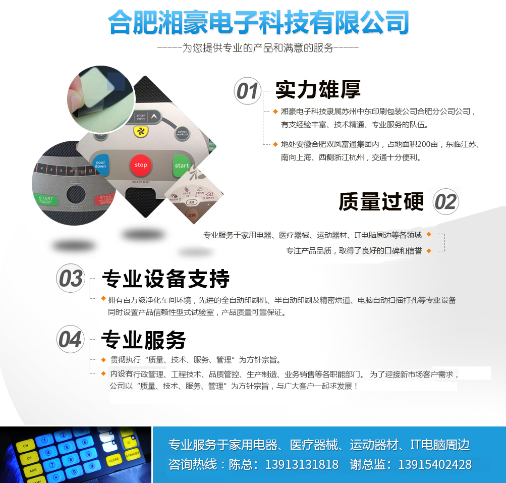 公司簡介 合肥湘豪電子科技有限公司系香港中意國際集團股份有限公司(1998年創(chuàng)建)下屬企業(yè),關系企業(yè)有:東莞中意塑膠制品有限公司(1996年創(chuàng)建),蘇州中意塑膠制品有限公司(2003年創(chuàng)建),蘇州中東包裝印刷有限公司(2007創(chuàng)建),蘇州捷瑞達自動化科技有限公司(2014年創(chuàng)建),東莞唯道實業(yè)有限公司(2014年創(chuàng)建),合肥六九機器人自動化科技有限公司(2015年創(chuàng)建);合作企業(yè)有:香港富通工業(yè)集團。 公司總部設在經(jīng)濟發(fā)達的香港,總公司這十幾年來先后在東莞,蘇州投資設廠,為滿足合肥市場廣大客戶的需求,總公司于2015年與香港富通工業(yè)集團合作在合肥投資設廠,打造電器控制面板,薄膜開關業(yè)界的航空母艦,創(chuàng)造專業(yè)產(chǎn)品,樹立精品觀念,鍛造高品質、高服務的企業(yè)形象,樹立正確的核心價值觀。全心全意為國內(nèi)外品牌企業(yè)服...榮譽資質
